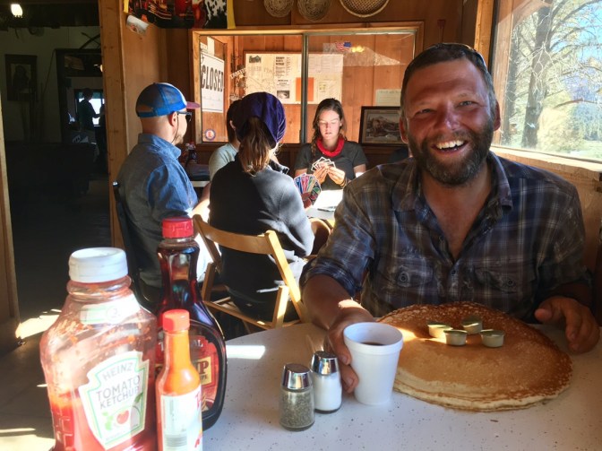 Der nächste Morgen beginnt mit einem "All You Can Eat Pancakes"-Frühstück im Grumpy Bear's Retreat. Das Restaurant liegt rund 3 Meilen vom Store entfernt. Um sieben Uhr geht das erste Shuttle. Mit etwa 15 anderen Hikern quetsche ich mich auf den PickUp. Gut, ist es nur eine kurze Fahrt. Im Restaurant heisst es dann erstmals Schlange stehen. Die Bestellung aufgeben geht dann aber ziemlich zügig. Um einiges länger ging es dann aber bis das Essen kam. Der Pancake war so gross, dass er weit über den Tellerrand aushing. Weitere 15 Minuten, oder mehr, kamen dann auch noch die Potatoes mit Eier und Speck dazu. Auch wenn "All You Can Eat" sehr verlockend tönt war dieses Frühstück nicht so das Wahre. Der Pancake war so gross, dass die meisten von uns (inkl. mir) ihn gar nicht erst aufessen konnten. Ehrlich gesagt hat mich das viele vorige Essen im Müll echt genervt. Hätte ich vorher gewusst wie gross der Pancake ist hätte ich ihn wohl gar nicht erst bestellt.
