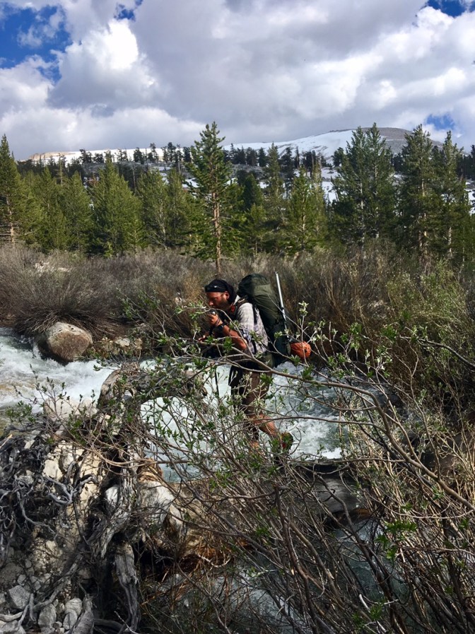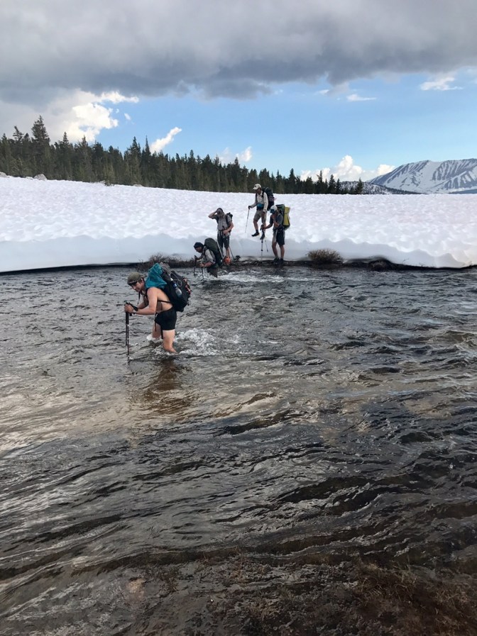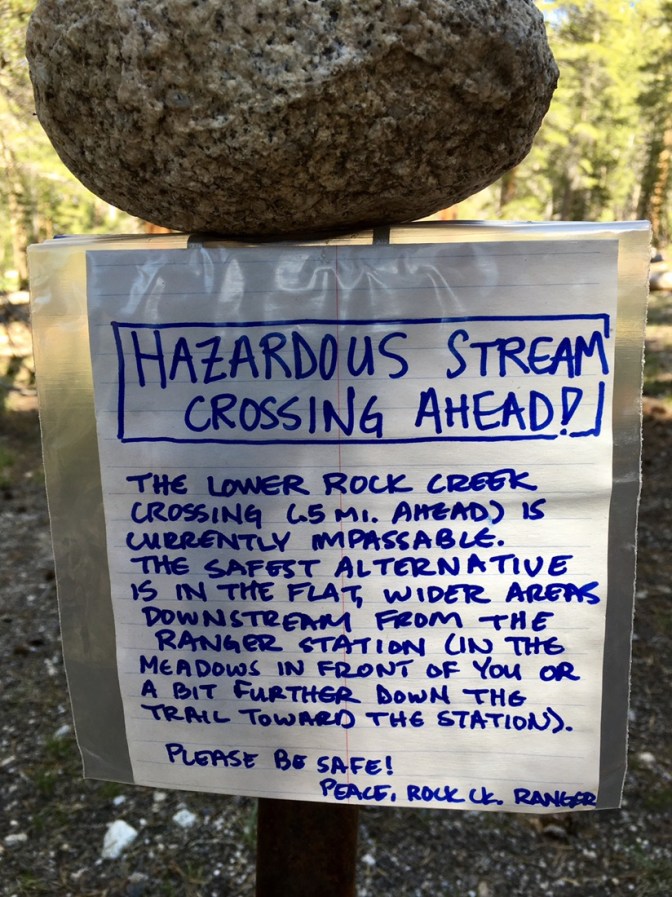 Als ich mich dann den 40 Meilen, welche Zsolt gelaufen ist, nähere liegt doch einwenig mehr Schnee. Immer häufiger ist auch der Trail unter Wasser. Einige Meilen später verliere ich dann auch das eine oder andere Mal kurz den Trail. Aber dank GPS ist das jeweils kein grosses Problem. Der Trail ist schnell wieder gefunden. Im späteren Nachmittag steht dann mein erstes River crossing an. Dabei treffe ich erneut auf Taylor & Swiss. Kurz vor dem Creek hängt eine Notiz von einem Ranger der uns davor warnt den Creek auf dem normalen Weg zu überqueren. Wir entscheiden uns daher für den einen Vorschlag von ihm und versuchen es durch die Meadow. An diese Stelle ist der Fluss nicht so stark und auch nicht tief. Dafür müssen wir aber länger durchs Wasser watschen da die Meadow komplett überflutet ist.