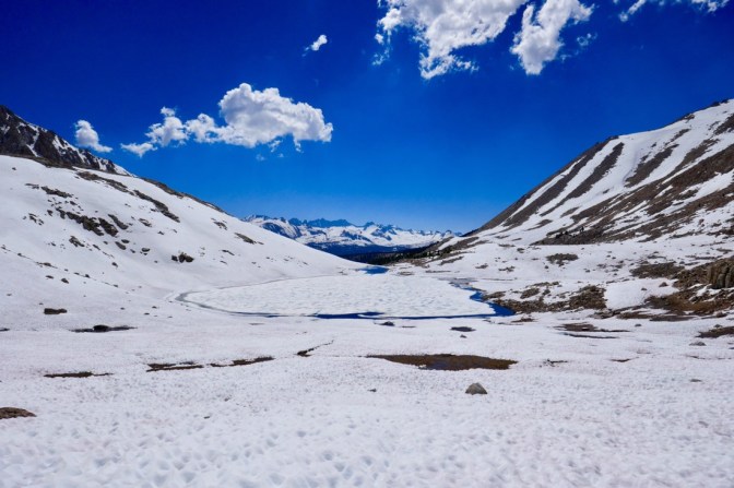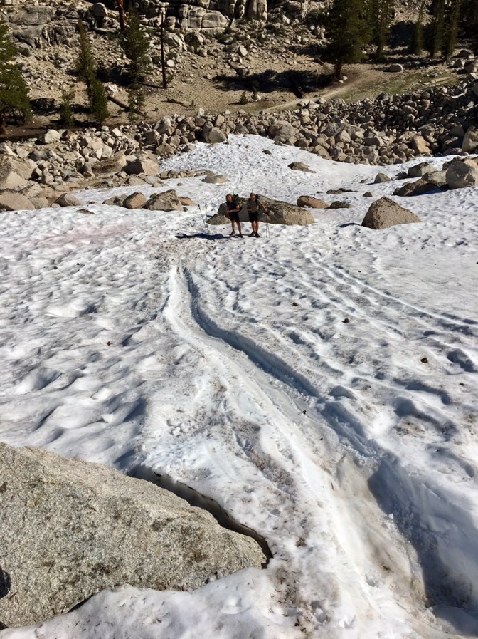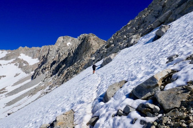 23.06.2017 – Heute steht der erste richtige Pass auf dem Plan. Es geht wieder massiv aufwärts. Der Forester Pass befindet sich auf 13'200 Fuss und ist somit der Höchste Punkt auf dem Pacific Crest Trail (Mt. Whitney liegt nicht auf dem PCT). Hier sind die Micro Spikes definitiv hilfreich, denn es liegt einiges mehr Schnee auf dem Weg zum Pass. Das gehen auf den Suncups (Wellen im Schnee) ist ziemlich anstrengend und bremst den Aufstieg stark.