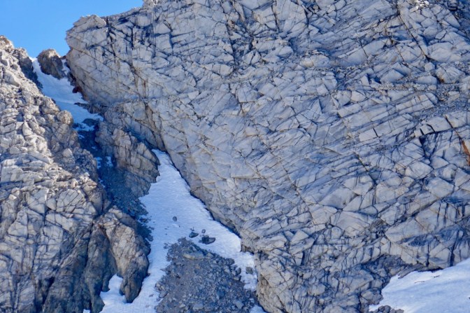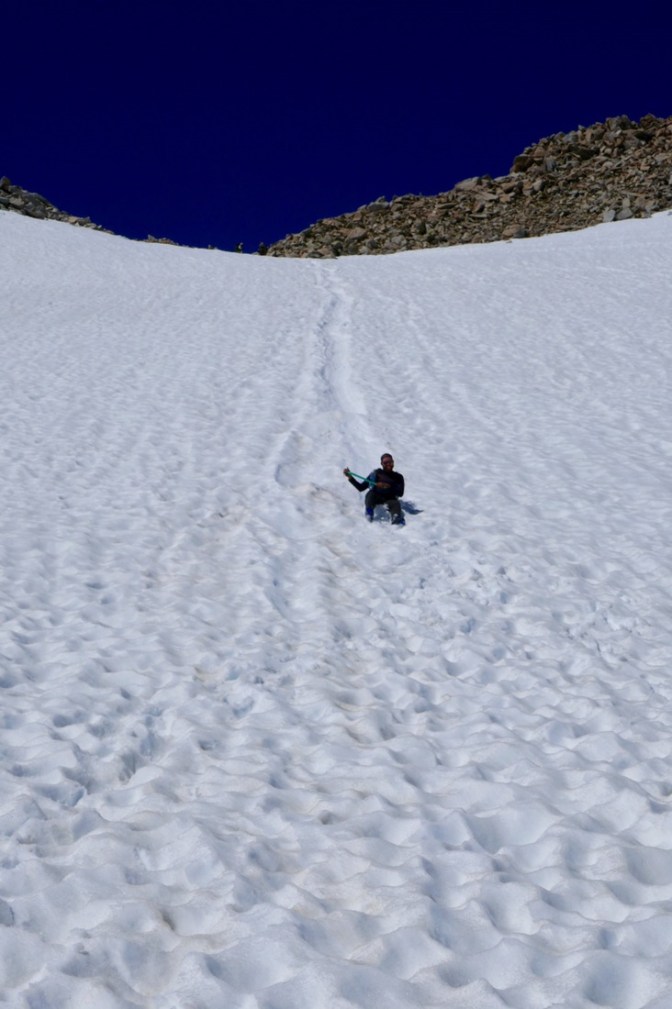 Nach einer kurzen Pause geht es dann an den Abstieg. Auf der Nordseite liegt noch mehr Schnee. Wir nehmen daher gerne mal die Abkürzung und Rutschen den Berg hinunter.